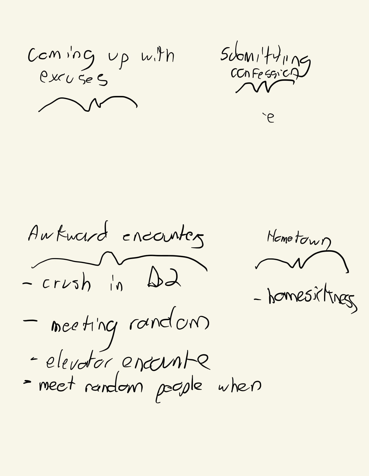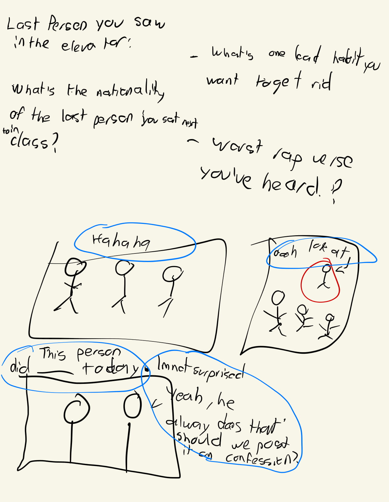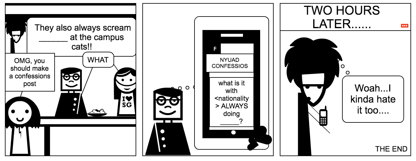 I like to follow funny and relatable pages on Facebook. If I don't rigorously monitor my phone usage, I could possibly spend an entire day scrolling through meme posts on Facebook. One page in particular I am not a big fan of is NYUAD Confessions. This page is used as a platform for NYUAD students to voice their concerns and gossip about the typical happenings of an NYUAD student. However, I often feel like all the posts are of the same tone and similar content, often along the lines of a student complaining about something or someone related to the NYUAD experience. This pushed me to think of a way of recreating the generic posts that are on the page. I am also interested in the idea of audience participation in different storytelling forms, something I have been challenged by in different projects in the past. Can something as rigid and structured as a story work whenever it depends on an unpredictable response from the audience? In light of the aforementioned, me and my partner Deena created a Confessions Experience generator, an interactive web comic experience that depends on the user answering 4 questions. Such questions were created keeping the NYUAD students in mind while also being generic enough for any millenial to be able to answer.