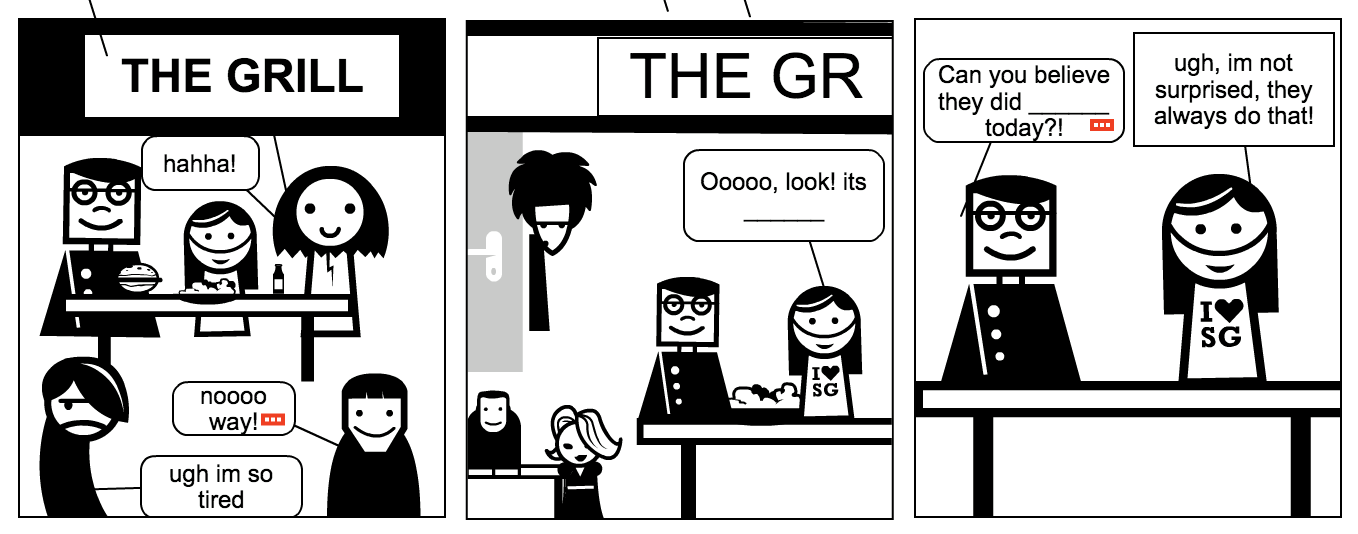 All in all, I believe we did a good job of incorporating user input to our comic. What I particularly liked is how even if the user inputs gibberish, mispronounced words, or incoherent responses into the form, the Confession that is generated is still credible as a lot of the Confessions that get posted (or general millenial facebook posts for that matter) tend to not always make complete sense. Something that we also wanted to address is how people tend to ride the influence wave created by social media postings, a wave that without us noticing, might also be targeted to us (this was addressed by the final twist ending of our comic).